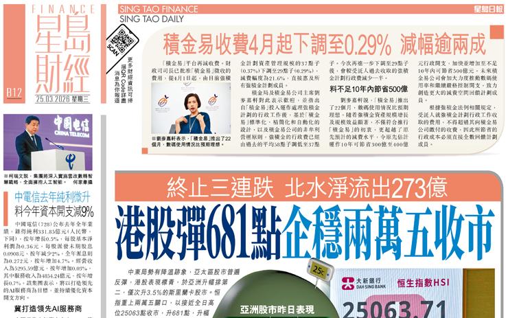 港股彈681點企穩兩萬五收市 終止三連跌 北水淨流出273億