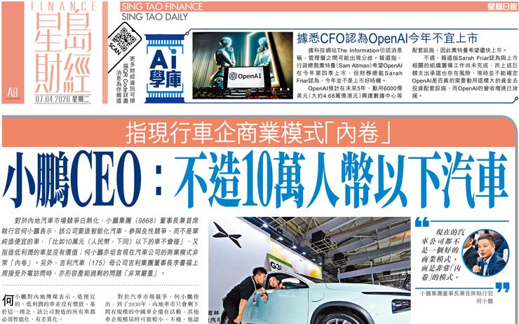 小鵬CEO:不造10萬人幣以下汽車 指現行車企商業模式「內卷」
