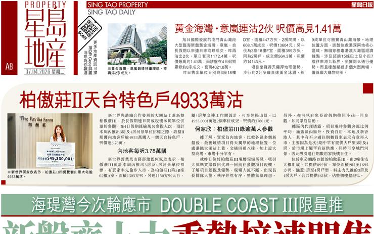 • 黃金海灣.意嵐連沽2伙 呎價高見1.41萬