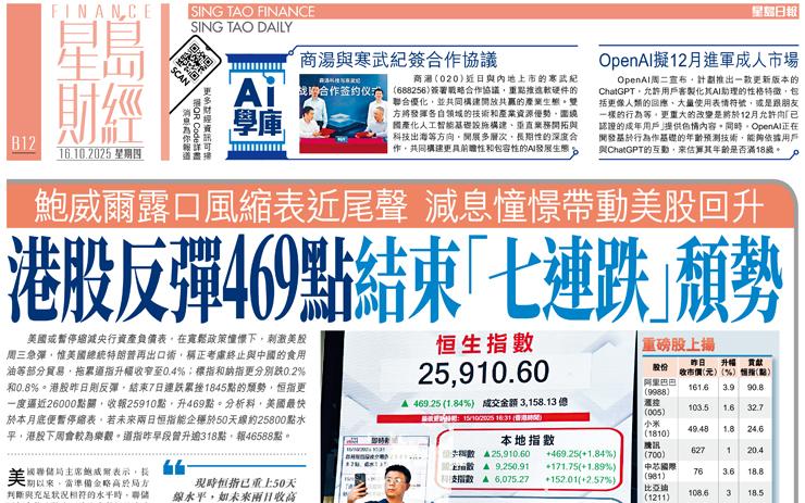 港股反彈469點結束「七連跌」頹勢 鮑威爾露口風縮表近尾聲 減息憧憬帶動美股回升