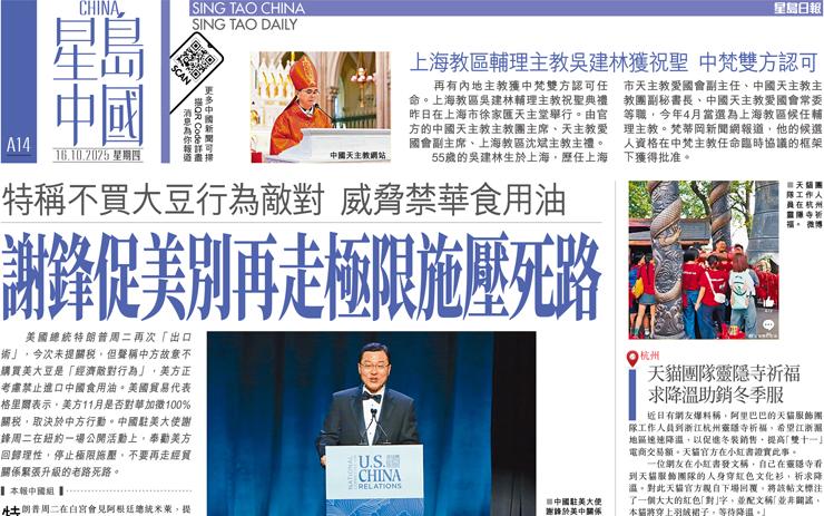 謝鋒促美別再走極限施壓死路 特稱不買大豆行為敵對 威脅禁華食用油