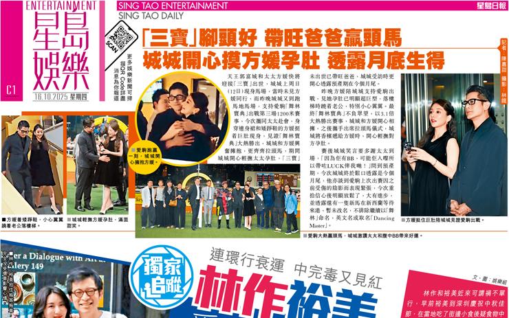 「三寶」腳頭好 帶旺爸爸贏頭馬 城城開心摸方媛孕肚 透露月底生得
