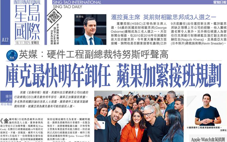 庫克最快明年卸任 蘋果加緊接班規劃 英媒:硬件工程副總裁特努斯呼聲高