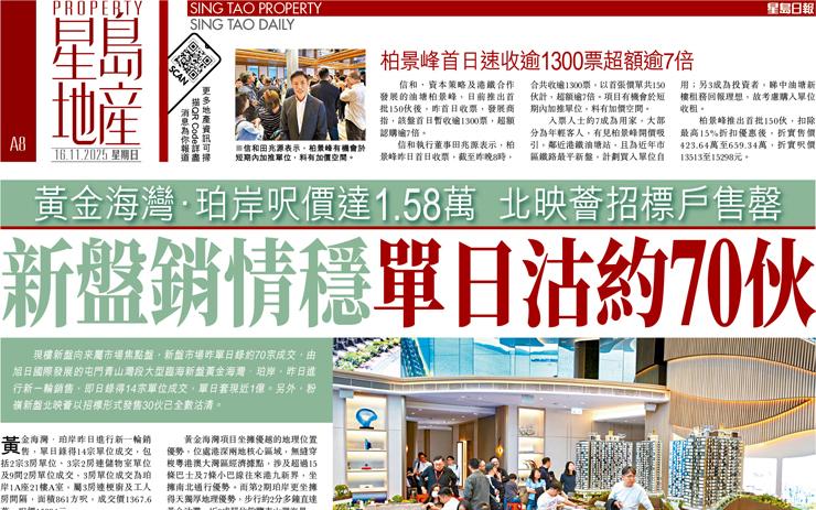 新盤銷情穩單日沽約70伙 黃金海灣.珀岸呎價達1.58萬 北映薈招標戶售罄