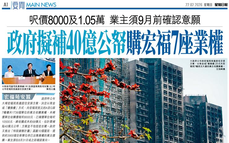 宏福苑安置 政府昨公布大埔宏福苑長遠居住安排方案,決定以現金或「樓換樓...