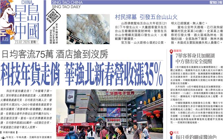 科技年貨走俏 華強北新春營收漲35% 日均客流75萬 酒店搶到沒房