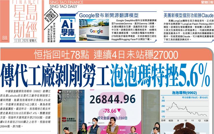 傳代工廠剝削勞工泡泡瑪特挫5.6% 恒指回吐78點連續4日未站穩27000