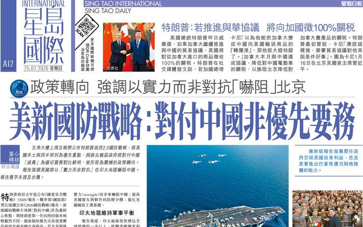 美新國防戰略:對付中國非優先要務 政策轉向 強調以實力而非對抗「嚇阻」北京