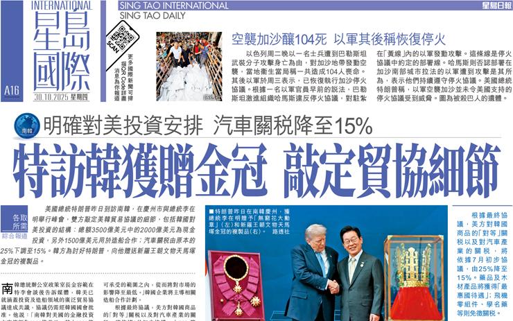 特訪韓獲贈金冠 敲定貿協細節 明確對美投資安排 汽車關稅降至15%