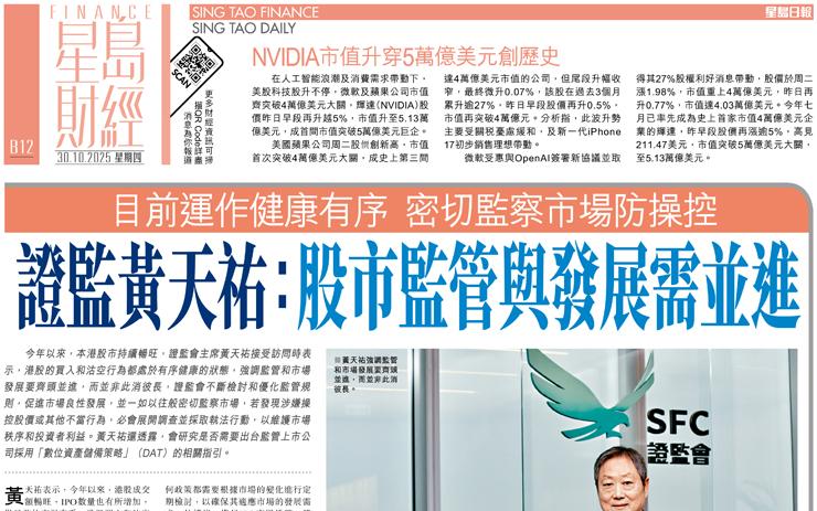 證監黃天祐:股市監管與發展需並進 目前運作健康有序 密切監察市場防操控