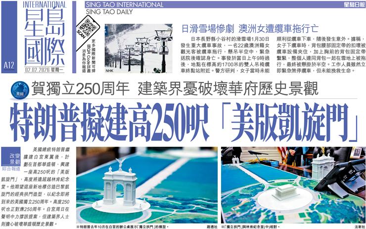 特朗普擬建高250呎 「美版凱旋門」 賀獨立250周年 建築界憂破壞華府歷史景觀