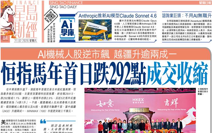 恒指馬年首日跌292點成交收縮 AI機械人股逆市飆越疆升逾兩成一