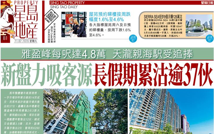 新盤力吸客源長假期累沽逾37伙 雅盈峰每呎達4.8萬天瀧親海駅受追捧