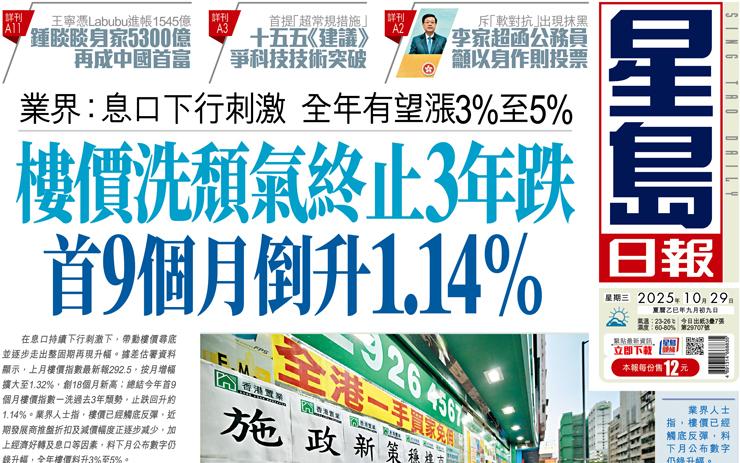 樓價洗頹氣終止3年跌 首9個月倒升1.14% 業界:息口下行刺激 全年有望漲3%至5%