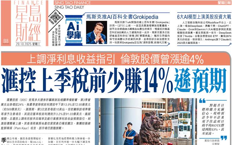 滙控上季稅前少賺14%遜預期 上調淨利息收益指引倫敦股價曾漲逾4%