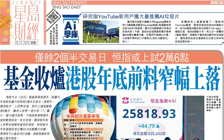 基金收爐港股年底前料窄幅上落 僅餘2個半交易日 恒指或上試2萬6點