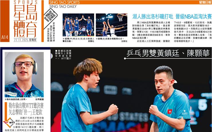 勒布倫出戰WTT總決賽 矢志擊敗「世一」王楚欽