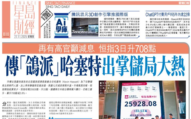 傳「鴿派」哈塞特出掌儲局大熱 再有高官籲減息恒指3日升708點