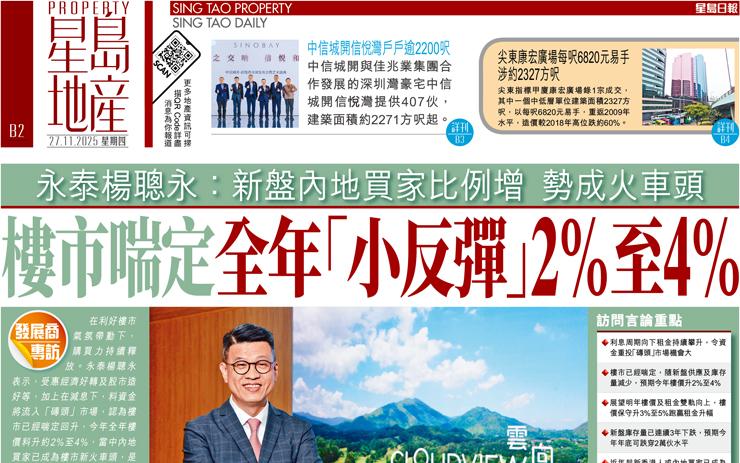 樓市喘定全年「小反彈」2%至4% 永泰楊聰永:新盤內地買家比例增勢成火車頭