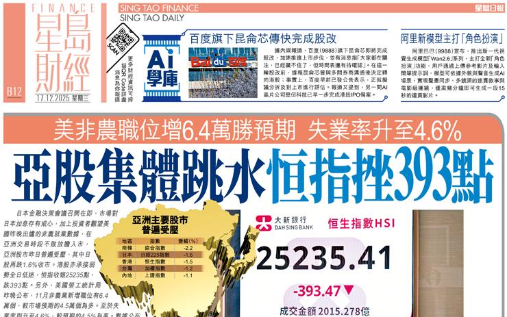 亞股集體跳水恒指挫393點 美非農職位增6.4萬勝預期 失業率升至4.6%