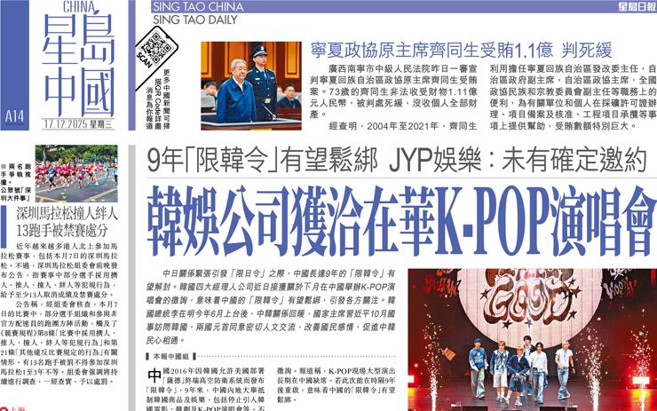 韓娛公司獲洽在華K-POP演唱會 9年「限韓令」有望鬆綁 JYP娛樂:未有確定邀約
