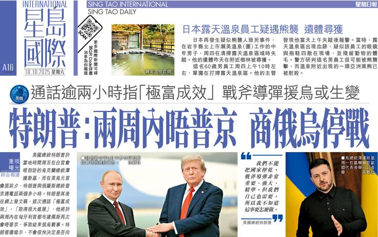 特朗普:兩周內晤普京商俄烏停戰 通話逾兩小時指「極富成效」戰斧導彈援烏或生變