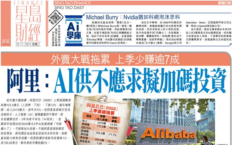 阿里:AI供不應求擬加碼投資 外賣大戰拖累 上季少賺逾7成