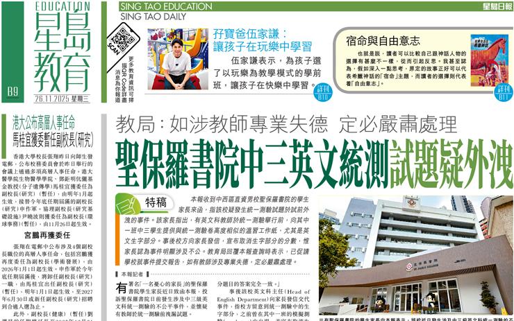 聖保羅書院中三英文統測試題疑外洩 教局:如涉教師專業失德定必嚴肅處理