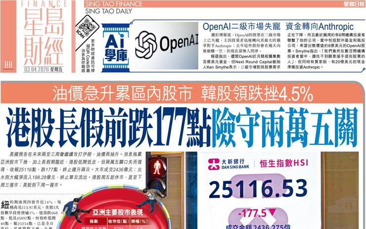 港股長假前跌177點險守兩萬五關 油價急升累區內股市 韓股領跌挫4.5%