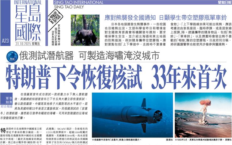 特朗普下令恢復核試 33年來首次 俄測試潛航器 可製造海嘯淹沒城市