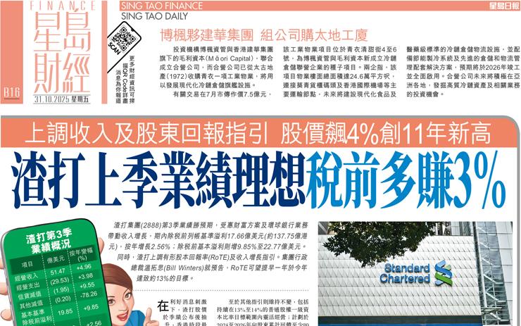 渣打上季業績理想稅前多賺3% 上調收入及股東回報指引 股價飆4%創11年新高