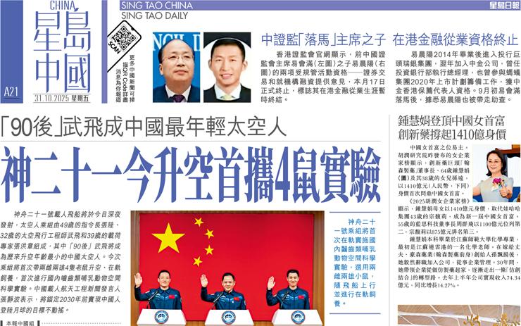 神二十一今升空首攜4鼠實驗 「90後」武飛成中國最年輕太空人