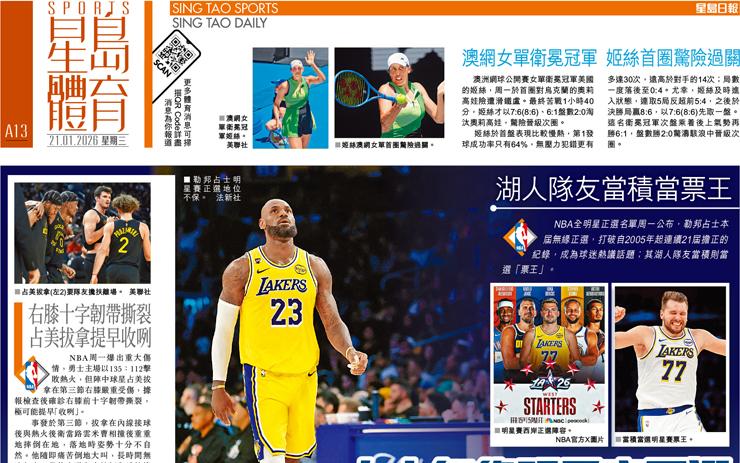 22年來首遭 占士無緣明星賽正選 湖人隊友當積當票王