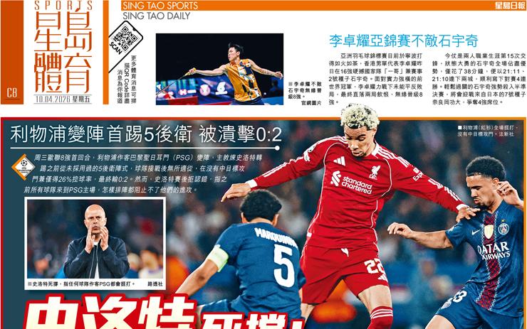 史洛特死撐:隊隊作客PSG都捱打 利物浦變陣首踢5後衛 被潰擊0:2