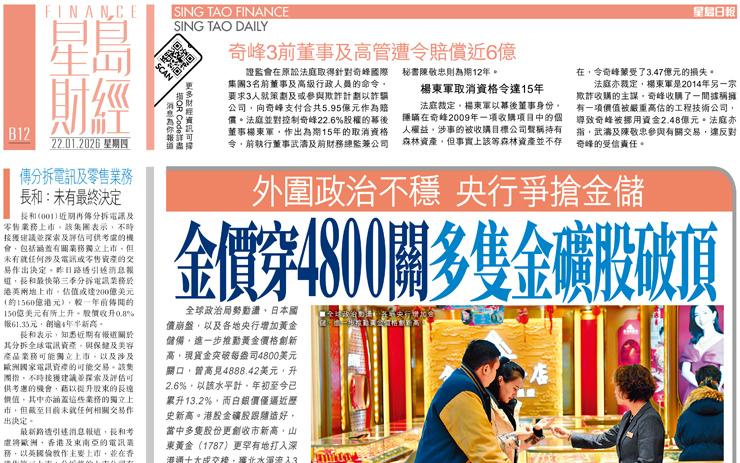 金價穿4800關多隻金礦股破頂 外圍政治不穩 央行爭搶金儲