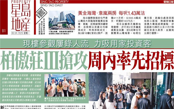 新盤銷情穩兩日沽約40伙 黃金海灣.意嵐受追捧 每呎高見1.43萬