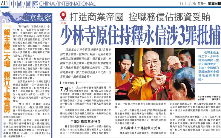 少林寺原住持釋永信涉3罪批捕 打造商業帝國 控職務侵佔挪資受賄