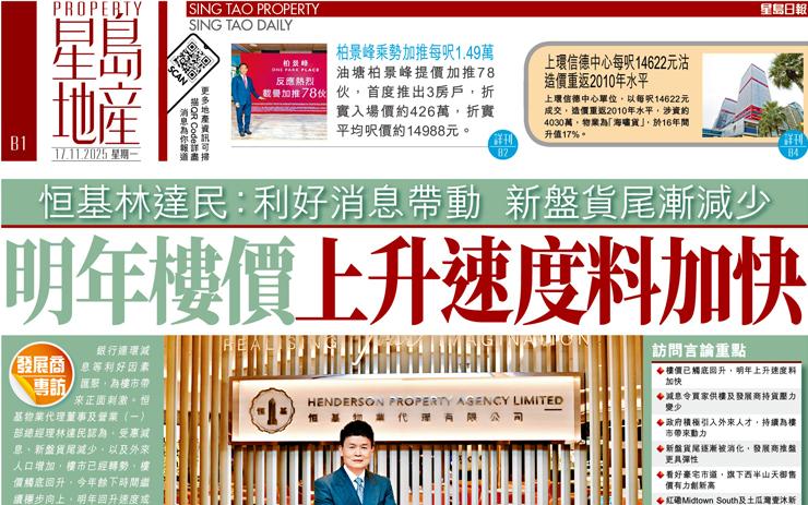 明年樓價上升速度料加快 恒基林達民:利好消息帶動 新盤貨尾漸減少