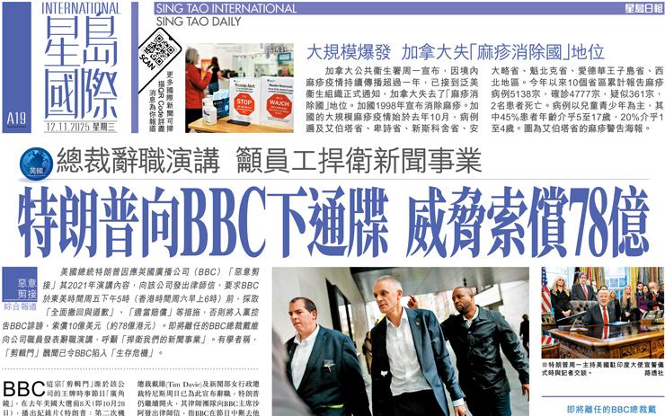特朗普向BBC下通牒 威脅索償78億 總裁辭職演講籲員工捍衛新聞事業