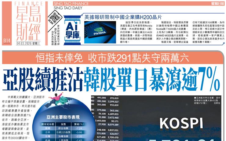 亞股續捱沽韓股單日暴瀉逾7% 恒指未倖免 收市跌291點失守兩萬六