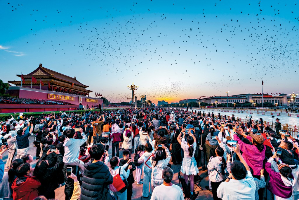 北京天安門廣場昨晨6時舉行升旗禮,12.1萬來自各地的觀眾齊唱國歌,共同慶祝中華人民共和國成立76周年。隨着國旗升至頂端,現場放出上萬隻和平鴿。「這...